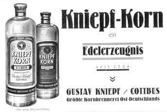 Zur Fa. „Kniepf“ schreibt Klaus Hartmann: “Friedrich Hermann Werner erwarb 1899 die Brennerei von Gustav Kniepf (gegründet 1743). Nach dessen Tod wurde die Produktion unter der Markenzeichnung „Gustav Kniepf“ fortgeführt. 1930-1931 übernahm Hermann Werner Jun. die Geschäfte in der Sandower Straße und baute die Produktionsstätte in der Ströbitzer Straße aus. Um 1931 änderte er das Gründungsjahr von 1743 auf 1726. Im Mai 1933 erwarb er die stillgelegte Firma „Melde“ mit allen Rechten von der ‘Norddeutschen Hefe-Industrie A.G. Berlin’ und verschmolz beide Firmen im Dezember 1933 zu „Kniepf-Melde“.