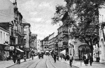 Cottbus. Ein Blick in die Spremberger Straße mit der Schlosskirche aus dem Jahre 1930