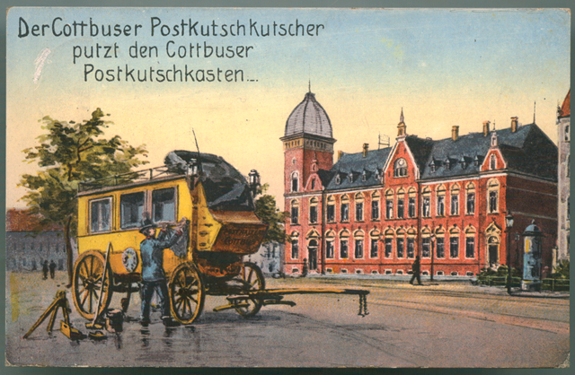 Georg Müller schrieb: „Der Cottbuser Postkutscher putzt auf dem Berliner Platz, und dies vor der Fassade des Kaiserlichen Post- und Telegraphenamtes. Zum Bildzeitpunkt war das ansehnliche Gebäude gerade mal runde zwanzig Jahre alt – mit seinen sandsteineingefassten Türen und Fenstern ein bauliches Kleinod im Neorenaissancestil. Eine Aufstockung erfuhr das Gebäude 1916; 1945 legte das Kriegsgeschehen letzte und gründliche Hand an.