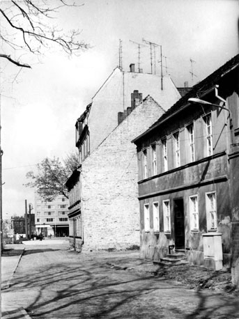 Karin Drabow teilte uns mit: „Der Fotograf steht unverkannbar in der Klosterstraße. Rechts zu sehen ist das Wohnhaus Klosterstraße 47. Dann kam die Bergstraße und dahinter – bereits abgerissen und nicht mehr zu sehen – das Wohnhaus Nr. 46.