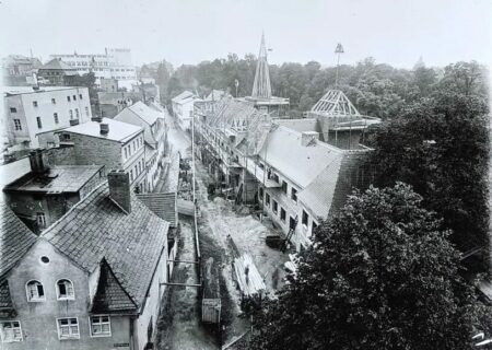 Der spitze Gerüstbau befindet sich über der Lindenpforte, die 1879 entstand, um schneller von der Post zum Markt zu gelangen. Das vordere Gerüst ist über der heutigen Gaststätte ‘Stadtwächter’. Die im rechten Hintergrund erkennbare Kuppel gehört, 1902 eingeweiht, zur jüdischen Synagoge. Sie wurde 1938 Opfer der Novemberpogrome und brannte aus.“
