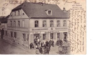 Der Cottbuser Klaus Reiter hat sich ebenfalls mit dem Motiv befasst: „Wir sind hier in Forst, Marktplatz/ Frankfurter Straße in der Vorkriegszeit. Leider wurde die Stadt im Krieg zu über 80 Prozent zerstört, darunter auch diese herrlichen Häuser. Unter anderem gab es die Hotels ‘Pitius’ und ‘Mohrs’. Im linken Gebäude war auch ein Zigarrenladen und die Dresdener Bank. Im rechten Haus betrieb der Herr Reinfeldt als Inhaber eine Butterhandlung; er verkaufte auch Wild & Geflügel. Daneben, Markt 19, sehen wir die Adler Apotheke und, nicht mehr im Bild, folgte dann das Fotogeschäft Thumann. Interessant ist auch, dass der Hotelier Emil Bochardt. Besitzer des Hotels ‘Mohrs’ am Markt, am 10.3.1892 in Berlin ‘stärkster Mann der Welt’ wurde. Auf einer Eisenstange im Genick trug er neun Personen. Nach dem Krieg gab es Pläne, vieles wieder aufzubauen, aber es fehlten wohl die Mittel. Wenigstens das eine Eckgebäude wurde so ähnlich gebaut mit einer kleinen Haube.“