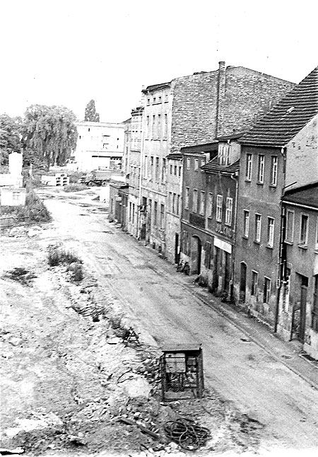 „Links sieht man noch den alten Baum. Ich meine, es war eine Trauerweide. Die steht heute nicht mehr. Wann die wegkam weiß ich allerdings nicht mehr“, so Waltraud Laugksch. „Heut ist der Verlauf der Gerberstraße nicht mehr so deutlich erkennbar, da sie zum Teil über Höfe und Parkplätze der Neubauten verläuft“, so Wolfgang Schenk.