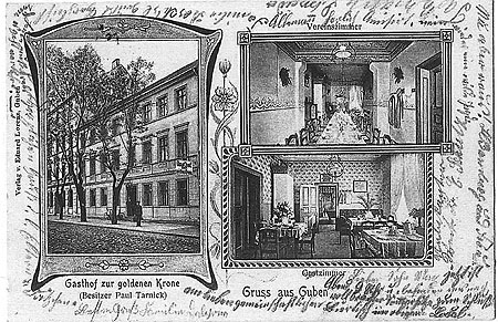 An dieses Gasthaus können sich nur noch wenige Gubener erinnern. Ausfürhlich jedoch schildert uns Eberhard Held aus Guben seine Erinnerungen und Überlieferungen: „Tarnicks Gasthaus mit ‘Fremdenzimmern’ befand sich in der Berliner Straße 6a, bis die Stadt auf die Idee kam, die Straße in Bahnhofstraße umzubenennen. Dessen ungeachtet wächst an dieser Stelle seit kurzem Gras. Durch die Erzählungen meines Vaters, der genau vor 100 Jahren in dieses Haus hineingeboren wurde, sind einige Ereignisse lebendig. Paul Tarnick hatte sechs Töchter, die in den Jahren in alle Himmelsrichtungen heirateten. Meine Oma, Kriegswitwe seit 1916, blieb im Elternhaus wohnen, so dass mein Vater einige Episoden aus der Zeit bis 1933 erzählen konnte. Durften doch die Kinder gelegentlich in der Gastwirtschaft nach ihren Möglichkeiten helfen. So auch beim Eintüten von Zigaretten aus Großpackungen in gängige Verpackungen á fünf Stück. Gern erzählte er auch aus der Zeit, in der die Nordbrücke gebaut wurde und die Kinder aus der Umgebung mit Schalbrettern aus Zigarrenkisten ein maßstabgerechtes Modell der Brücke unter Anleitung des Bauleiters errichten durften. Heute liegt die Gegend am Rand der Stadt. Zu Beginn des 20. Jahrhunderts aber war dies am Weg vom Bahnhof über die Brücke ins Stadtzentrum. Eingekehrt sind Bahnangestellte und Handelsreisende mit Ziel Guben oder auf der Durchreise mit Umsteigen auf dem ‘Bahnknoten’ Guben und der Weiterfahrt am nächsten Tag. Wie mancherorts üblich, gehörte auch ein Stall zum Anwesen. Eine oder mehrere Kühe halfen bei der Versorgung der Gäste. In den 1930er-Jahren wurde die Wirtschaft verpachtet. Nach dem Krieg fiel das Haus Brandstiftern zum Opfer. Heute erinnert noch eine Stele an der Familienbegräbnisstätte auf dem Westfriedhof an Paul Tarnick. Das Grundstück diente in den Jahren bis 1989 den Arbeitern der Maschinenfabrik als Fahrradständer. Das Programm ‘Der grüne Pfad’, aufgelegt von der Stadt Guben, sorgte für den Abriss der unansehnlichen Gebäude der ehemaligen Maschinenfabrik und damit auch der Kultivierung des Geländes, auf dem einst das Gasthaus ‘Goldene Krone’ stand.“ Vielen Dank! Ein Bild gewinnt Eberhard Held. Glückwunsch!