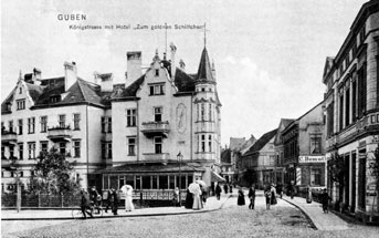 Dietrich Kühn schrieb: „An der Crossener Brücke begann die Königsstraße. Hier befand sich auch das Hotel ‘Zum Goldenen Schiffchen’. Der Name erinnert an die Weiße-Schifffahrt, die seit dem Mittelalter bis in das 19. Jahrhundert hinein eine der wichtigsten Erwerbsquellen der Gubener war. Im ‘Wohnungsanzeiger der Stadt Guben’ aus dem Jahr 1866 findet man 59 Mal die Berufsbezeichnung ‘Schiffer’ und 16 Schifferwitwen werden genannt. Von der Brücke/Kirschmarkt bis zur Mündung der Lubst in die Weiße erstreckte sich der Hafen der Gubener Schifffahrt mit den Anlegestellen der Kähne (Zillen genannt). In der Nähe, an der so genannten Kahnbaustelle, ließen die Gubener Schiffer ihre Lastkähne bauen. Auch war das ‘Schiffchen’ ein Treff einiger Gubener ‘leichten Mädchen’, wie man so von alten Leuten erzählten hörte.“