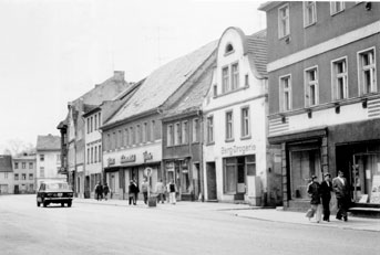 Familie Dieter Herrmann hat uns ausführlich geschrieben: „Diese Aufnahme könnte etwa Anfang der 80er Jahre oder davor entstanden sein, auf alle Fälle aber vor der politischen Wende, besonders auffällig wegen der bestehenden Altbausubstanz der auf dem Bild von rechts nach links erkennbaren Gebäude. In gleicher Reihenfolge wie oben erwähnt, wurde Gebäude 3 und 4 abgerissen und durch ein völlig neuerbautes Wohn- und Geschäftshaus als einheitlich neuer Komplex erbaut, in dem eine Vorderansicht der ehemaligen Berg-Drogerie Kurt Polske mit eingebunden wurde. Zwischen dem rechtsseitig erkennbaren Gebäude und der Berg-Drogerie befindet sich die Amaliengasse. In diesen abgerissenen Gebäuden befanden sich einst das Kolonial- und Gemüsegeschäft Schiemenz und die wohl allen älteren Sprembergern bekannte Konsumverkaufsstelle. Vieles könnte ich zum Thema Lange Straße noch berichten, bin ich doch in der in unmittelbarer Nähe liegenden Jüdenstraße geboren. Ich erinnere mich noch besonders daran, dass einmal in der Woche nach den Kriegsjahren auf der Straße ein Brotverkauf stattfand. Initiatorin war damals die Geschäftsinhaberin Frau Schiemenz.“
