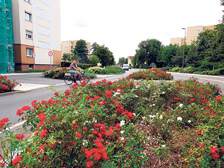 Was die Briesker Straße darüber hinaus auszeichnet? Nun, das viele Grün links und rechts der Fahrbahn ist schon ein Kapitel für sich. Direkt am nordöstlichen Eingang zur Trasse, also in Höhe Abzweig August-Bebel-Straße, werden die Passanten von derzeit in schönstem Rot und Weiß blühenden Rosen begrüßt. Die Pflanzen wachsen eigentlich direkt auf der Straße, und zwar in der dortigen Verkehrsinsel, die den Radfahrern eine weitestgehend gefahrlose Passage vom Stadtzentrum auf die Fahrradtrasse der Ernst-Thälmann-Straße ermöglicht.