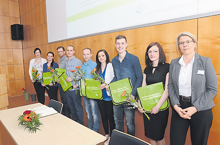 Die neue Pflegedienstleiterin des CTK, Andrea Stewig-Nitschke (r.) überreichte am Mittwoch den acht Absolventen der Gesundheits- und Krankenpflege ihre Zeugnisse. Sie durften sich wie die 21 neuen Azubis erstmals in ein Goldenes Buch des Klinikums eintragen Foto: Ha.