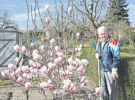 Karl-Heinz Prüfer ist 78 Jahre alt. Seit 1988 hat er einen Garten in der Anlage „Einigkeit“. Die Gartenanlagen liegen günstig zwischen den beiden Wohngebieten in Sandow und Schmellwitz, erklärt sich der Kleingärtner die Beliebtheit der Kleinode an dieser Straße. Zudem ist der toom-Baumarkt gleich in der Nähe. „Das ist die beste Jahreszeit“, schwärmt Karl-Heinz Prüfer. In seinem Garten blüht die Magnolie. Schnittlauch hat er bereits geerntet. Sein Gartennachbar erinnert sich daran, dass die Straße nach Schmellwitz zu DDR-Zeiten erweitert werden sollte. Hier wären auch einige Gärten in Gefahr gewesen. Die stark eingerückte Tankstelle ist, wie der Kleingärtner erklärt, ein sichtbares Zeichen dieser Vergrößerungsidee. Nicht nur wem das Kreuz nach der Gartenarbeit schmerzt, ist gleich nebenan im Ärztehaus bei Stephan Heidrich richtig. Der Heilpraktiker hat sich auf chinesisch-japanische Akupunktur und muskuläre Massagen spezialisiert.