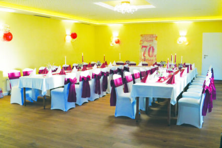 Der große Saal des Hauses bietet Platz für bis zu 150 Gäste und kann flexibel geteilt werden. So stehen sowohl ein kleinerer Bereich für etwa 50 als auch ein größerer Saal für bis zu 120 Personen zur Verfügung. Damit ist das Gasthaus ein beliebter Ort für Feierlichkeiten aller Art – von Trauerfeiern und Einschulungen über Vereins- und Familienfeste bis hin zu Hochzeiten oder Firmenveranstaltungen. Für die kulinarische Begleitung sorgt das Team mit abwechslungsreichen, hausgemachten Buffets. „Wir möchten, dass jede Feier bei uns rundum gelingt – von der Planung bis zum letzten Gast“, sagt Ralf Drogan.