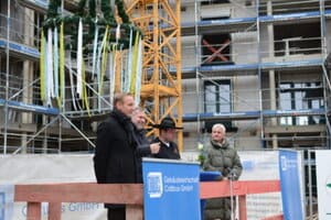 Kolkwitz (MB). Nach dem Baustart im März konnte in der vergangenen Woche das Richtfest für das neue Hortgebäude an der Grundschule Kolkwitz gefeiert werden. Bereits zum Schuljahr 2022/2023 können hier 140 Hortkinder auf 990 Quadratmeter Nettogrundfläche sich so richtig austoben und auch für den Kinder- und Jugendtreff entstehen Räumlichkeiten für bis zu 50 Kinder. Das hochmoderne Gebäude kostet 2,9 Millionen Euro. 610 000 Euro Förderung kamen von der ILB und 90 000 Euro vom Landkreis Spree Neiße. Hintergrund des Neubaus sind steigende Schülerzahlen in der Gemeinde. Zudem ist eine Doppelnutzung von Schulräumen und Hort unzulässig. Der Bürgermeister Karsten Schreiber freut sich beim Richtfest bereits auf die Fertigstellung dieses Gebäudes im kommenden Sommer. “Hier entsteht für die Kinder ein richtig tolles Haus in dem sie und die Mitarbeiter sich sehr wohlfühlen werden”, ist er sich sicher. Den Richtspruch hielt der Geschäftsführer der S+K Dachbau GmbH Peter Sorge. Im Anschluss führte der Architekt Uwe Wittig durch den erweiterten Rohbau und erklärte das Raumkonzept.