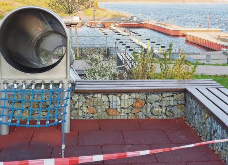 Großräschen (MB). Rot-weiße Bänder jetzt leider auch vor den schönen Spielanlagen am Stadthafen Großräschen mit seinen noch stillen 130 Liegeplätzen. Bevor hier das fröhliche See-Treiben beginnt haben immerhin jetzt schon die Radler einen schönen Ufer-und Kanalweg vor sich.
