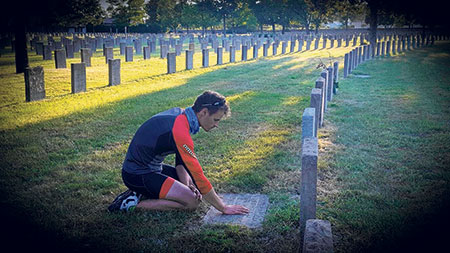Bis zu Dir, mein Urgroßvater Erich Kugland, war es ein weiter Weg. Er führte mich 2 200 km, mit dem Fahrrad von der Nordsee durch die Schweiz über die Alpen nach Italien. Hier erreichte ich in Genua das Mittelmeer. Die Südküste Italiens entlang ging es nach Frankreich. Hier war Dein Einsatzgebiet im 2. Weltkrieg, in dem Dein junges Leben ein Ende fand. Hier wurde Dein Convoi von französischen Freiheitskämpfern angegriffen und Du wurdest durch einen Schuss ins Herz getötet. Das Einzige was von Dir den Weg zurück in die Heimat fand, war Deine blutverschmierte Geldbörse. Von Deinem Sohn (meinem Opa) weiß ich, dass Dein Verlust zuhause ein Loch hinterlassen hat, welches sich niemals schließen ließ. Nun ist Dagneux bei Lyon Deine Ruhestätte. Du bist denkmalgeschützt. Und vielleicht hast Du so die Unsterblichkeit erlangt?