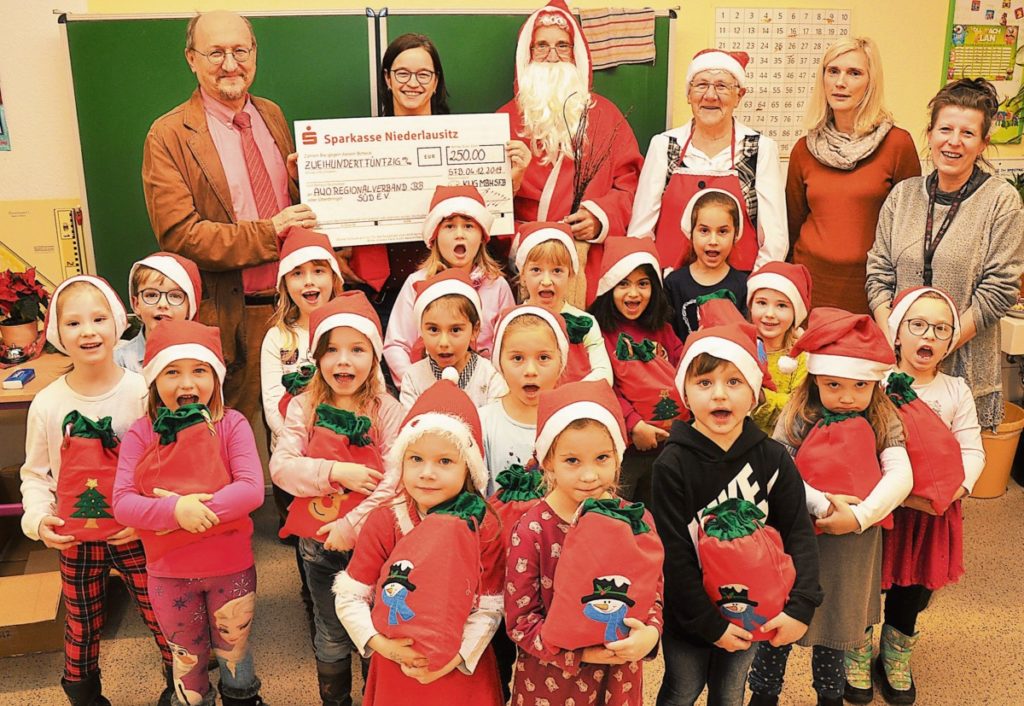 Große Freude bei allen Beteiligten am gemeinsamen Weihnachtssingen in der Grundschule am See - und ganz besonders bei den kleinen Sängern, dem Kinderchor des Horthauses der Arbeiterwohlfahrt Brandenburg Süd e. V., die von KWG-Geschäftsführer Roland Osiander (hinten links) eine Spende für den Chor und ein kleines Geschenk in Empfang nehmen konnten Foto: KWG
