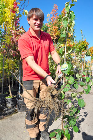 Beim Pflanzen gibt es einige Tipps zu beachten. So werden beschädigte und zu lange Wurzeln gestutzt und anschließend einen ganzen Tag ins Wasser gestellt. Das Pflanzloch sollte 80 x 80 Zentimeter groß sein und mit einem Mix aus Garten- und Komposterde gefüllt werden. „Auf keinen Fall sollte mineralischer und auch frischer Naturdünger eingebracht werden, er verbrennt die Wurzeln“, rät Christel Holz weiter. Stattdessen wird die Wurzel gut eingewässert und mit einem stabilen Pfahlgerüst gestützt. Beim Pflanzen ist – im Gegensatz zu Rosen – darauf zu achten, dass die Veredlungsstelle etwa eine Hand breit über der Erde liegt. Ragen einige Wurzeln aus dem Boden heraus, ist das kein Problem, sie trocknen ab. „Ratsam ist nach dem Pflanzen ein erster Erziehungsschnitt. Hier beraten wir gern, denn es gibt sehr viele und schöne Möglichkeiten für Gehölze, beispielsweise, welche optische Funktion sie im Garten erhalten sollen.“ Wichtig sind auch gerade jetzt erste Schutzmaßnahmen. „Harter Frost macht den jungen Stämmchen zu schaffen. Deshalb rate ich zu einem weißen Schutzanstrich. Der besteht hauptsächlich aus Kalkverbindungen und Spurenelementen. Er schützt vor der Sonneneinstrahlung, die im Winter zu Rissen in der Rinde führen kann“, so Jürgen Kusserow. Alternativ sind Schutzmatten möglich. Dabei muss aber darauf geachtet werden, dass damit kein willkommener Unterschlupf für Insekten entsteht.