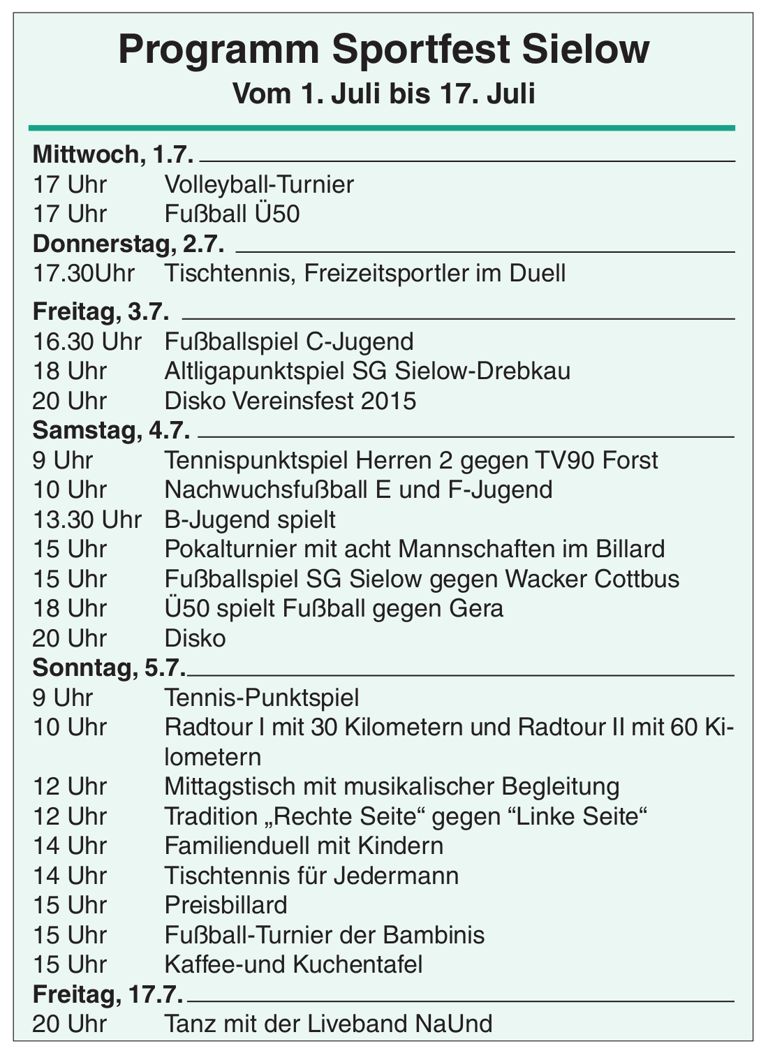 An diesem Wochenende, 4./5.07.15 feiern Guhrow und Sielow Sportfest: Guhrow (mk). Den Auftakt zum Sportfestsamstages bildet um 16 Uhr das Hauptspiel des SV Guhrow gegen den VfB Döbbrick um den Bürgermeisterpokal. Ab 18 Uhr ist Line Dance zu erleben. Mit Tanz klingt der sportliche Tag ab 20 Uhr aus. Am Sonntag ist Familientag ab 14 Uhr. Glücksrad, Basteln, Hüpfburg, Riesenseifenblasen, Tombola, bunte Verkaufsstände, Kaffee und Kuchen, Eismobil und „DJ Timobil“ sowie Kinderwettspiele sorgen für Unterhaltung. Sportlich geht es hingegen beim Kleinfeldturnier mit acht Mannschaften zu. Es folgen Tanzvorführungen der Linedancer und ein Hindernisparcours sowie ab 18.30 Uhr das Preis-Elfmeterschießen für alle.