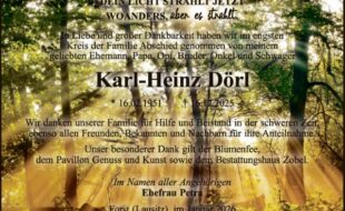 Finden Sie hier Traueranzeigen, Todesanzeigen und Beileidsbekundungen aus Südbrandenburg. Traueranzeigen und Danksagungen können Sie direkt hier online aufgeben und gestalten.