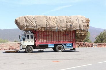 Uns begegnen in den Bergen Lkw’mit imposanten Ladungen – der Fahrer schläft hier gerde im Schatten seiner Fuhre.