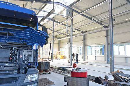 Auf den drei neuen Arbeitsspuren dieser Halle, jede 30 Meter lang, passen jeweils drei Sattel-Zugmaschinen hintereinander oder zwei Lkw oder sogar zwei große Reisebusse. Bestückt sind die Arbeitsplätze mit allen nötigen Diagnose- und Prüfständen